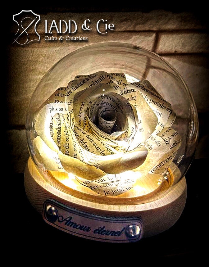 Offrez un cadeau unique avec cette rose éternelle, délicatement réalisée à la main en papier. Installée sous une élégante cloche en verre, elle est illuminée par une douce guirlande qui apporte une touche de magie et de poésie à votre décoration. Ce présent original est le choix parfait pour montrer votre affection à une maman, une mamie ou toute personne chère à votre cœur. Son design intemporel et artisanal en fait une pièce exceptionnelle, idéale pour célébrer des moments spéciaux. Offrez une attention qui dure et enchante, grâce à cette rose unique en son genre !