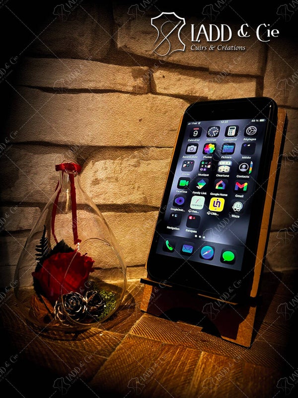 Fabriqué en France avec un mélange raffiné de bois et de cuir, cet accessoire unique se transforme en cadre photo tout en servant de support pour smartphone.